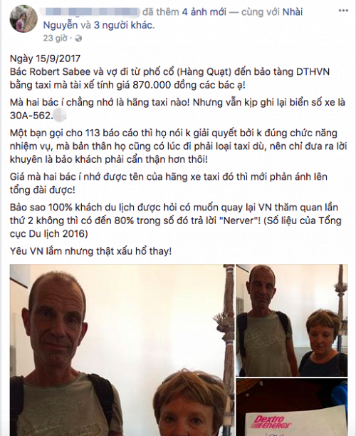 “Ngày 15/9/2017, bác Robert Sabee và vợ đi từ phố cổ (Hàng Quạt) đến bảo tàng DTHVN bằng taxi mà tài xế tính giá 870.000 đồng các bác ạ! Mà hai bác í chẳng nhớ là hãng taxi nào! Nhưng vẫn kịp ghi lại biển số xe là 30A-562.**.