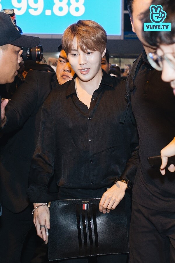 Ha Sungwoon là nghệ sĩ Hàn hạ cánh tại sân bay Tân Sơn Nhất đầu tiên. Khác với hình ảnh "chàng mây" dễ thương, anh chàng xuất hiện với "cây đen" toàn tập từ trang phục đến phụ kiện như đồng hồ, túi xách. Tuy nhiên, màu đen lại tôn lên vẻ đẹp đầy nam tính và quý phái của Ha Sungwoon.