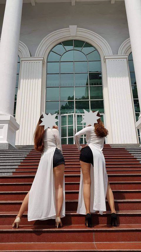 Mới đây, trang HCMUPer's Confessions đăng loạt ảnh chụp cảnh hai cô gái được cho là sinh viên ĐH Sư phạm TP.HCM mặc áo dài cùng quần ngắn chụp ảnh kỷ yếu.