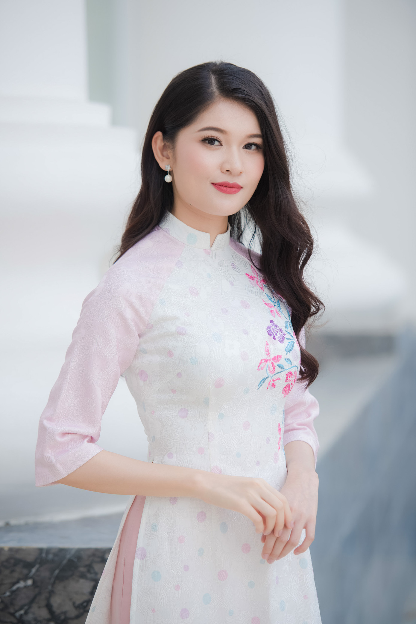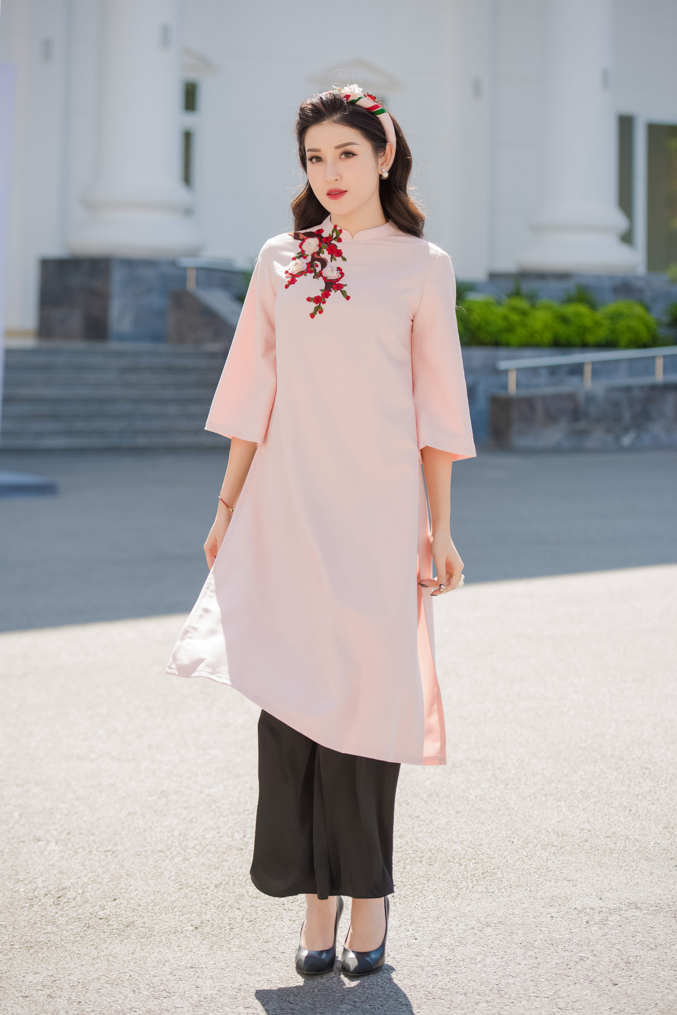 Huyền My diện chiếc áo dài màu hồng nude cho chính tay cô thiết kế. Huyền My cũng đã khéo léo kết hợp bộ áo dài với phụ kiện ngọc trai và mái tóc uốn xoăn nhẹ nhàng.