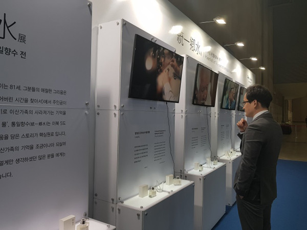 Bộ nước hoa mang tên "Nước hoa thống nhất" được trưng bày tại cuộc triển lãm ở trung tâm báo chí dành cho các phóng viên đưa tin về cuộc gặp tại triển lãm KINTEX Goyang, tỉnh Gyeonggi.