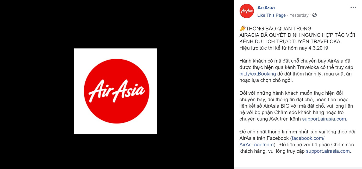 Cụ thể hơn, trong một bài đăng mới nhất trên trang Facebook của hãng hàng không nổi tiếng AirAsia đã đăng tải thông tin về việc chính thức ngưng hợp tác với kênh du lịch trực tuyến được rất nhiều người biết đến tại Việt Nam. Theo đó, hãng hàng không AirAsia thông báo tới những khách hàng đã có mã đặt chỗ chuyến bay của hãng có thể truy cập vào một trang web khác để có thể đặt thêm hành lý, mua suất ăn và đổi chỗ ngồi.