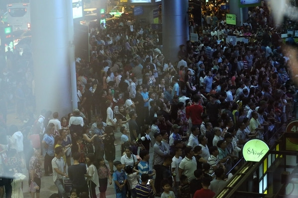 Đoàn người chờ chen chúc, khiến một số người cùng đồ đạc di chuyển vào khu vực chờ bay gặp nhiều khó khăn.