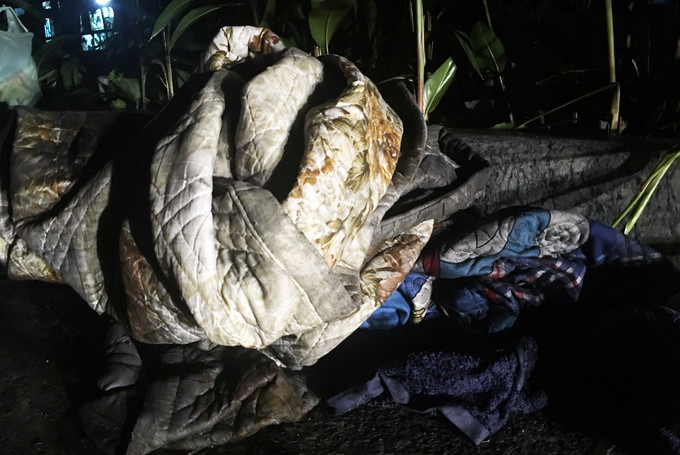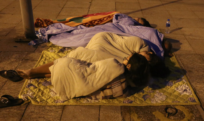 3h sáng, một gia đình mang chăn chiếu ngủ ở khuôn viên khu chung cư.
