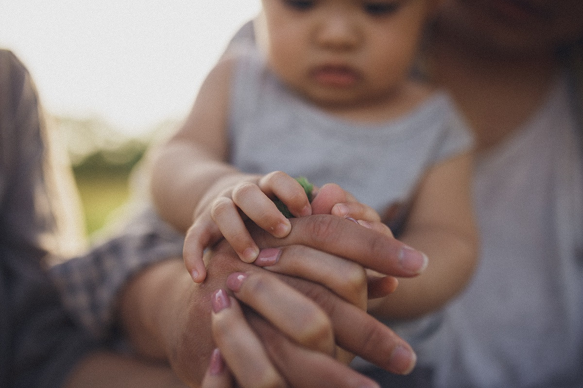 Bàn tay lớn nắm lấy bàn tay nhỏ, hoàn thành một món quà tuyệt vời dành tặng cho thành viên thứ ba trong gia đình.