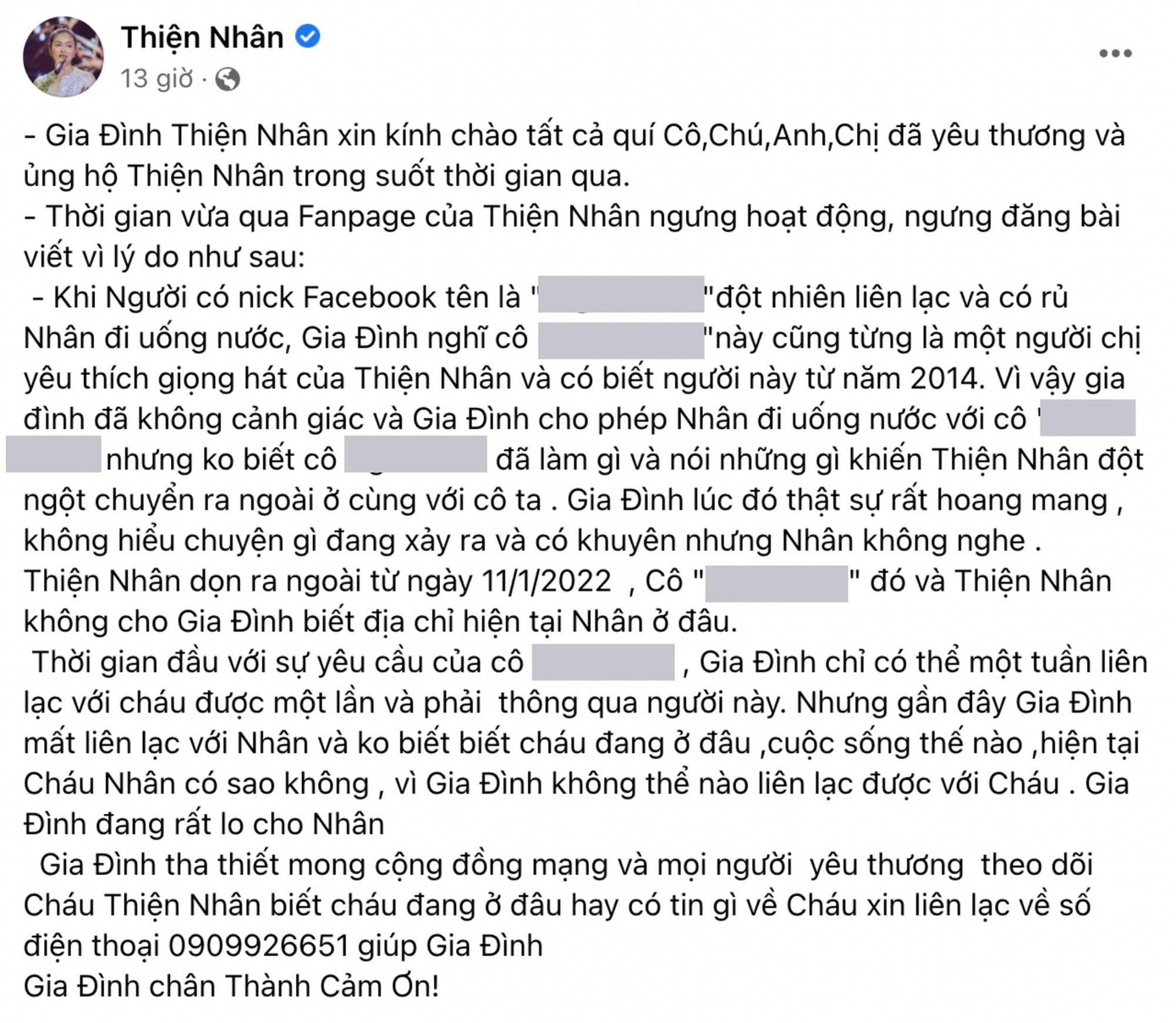 Cụ thể, vào tối 15/7, gia đình của Thiện Nhân đã lên tiếng “cầu cứu" cư dân mạng về sự "mất tích" của con gái. Ngay sau đó, Thiện Nhân đã có buổi livestream đính chính những thông tin sai lệch trong bài đăng của gia đình, đồng thời tiết lộ một số vấn đề khiến netizen xôn xao: Đi hát 8 năm chăm lo gia đình vì anh chị không đi làm, công khai người yêu đồng giới, mâu thuẫn với gia đình về quyền quản lý fanpage và căn nhà do người hâm mộ tặng.
