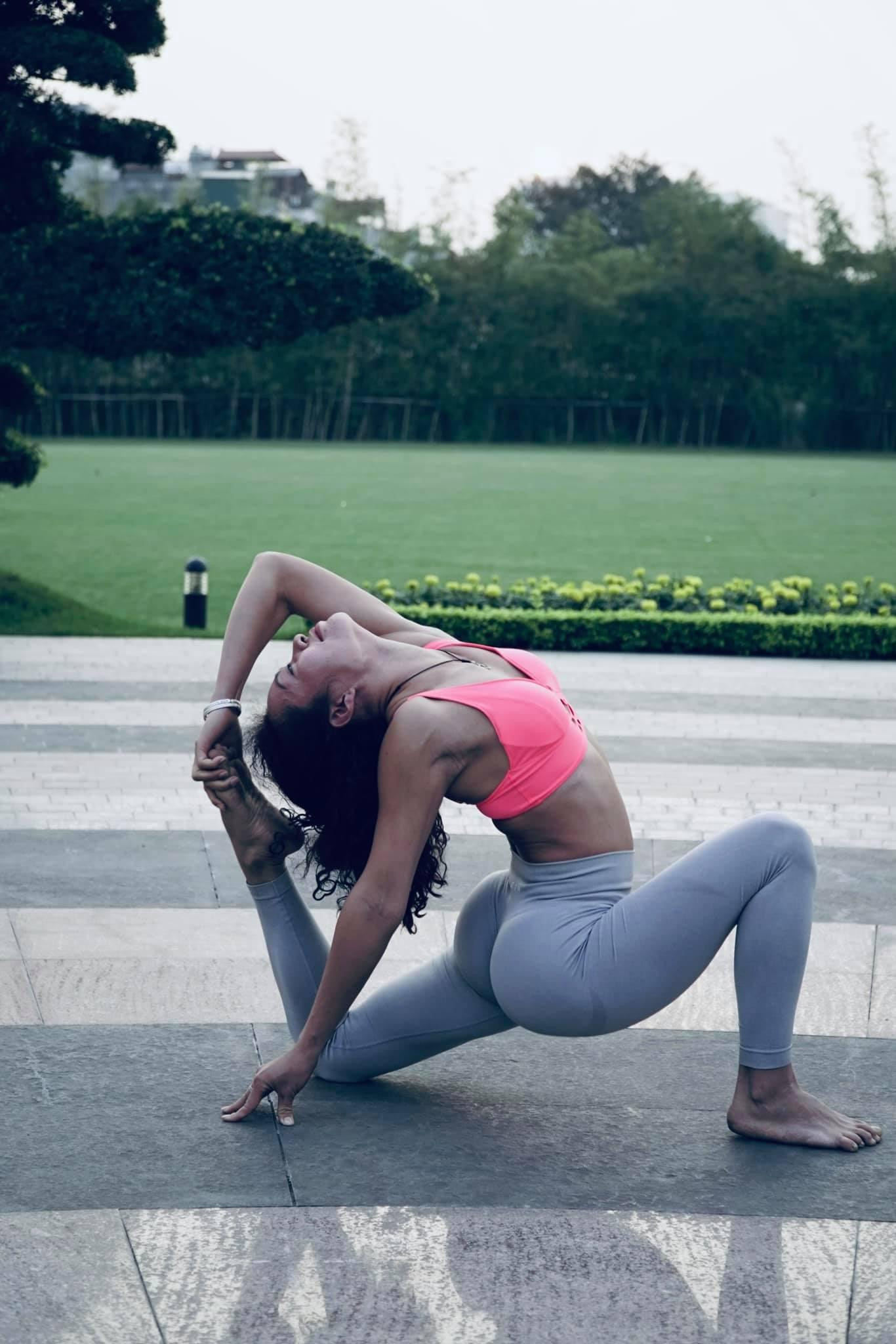 Nhận thấy một số bộ phận còn lệch, mất cân xứng, chị vừa tập yoga, vừa kết hợp các bài tập bổ trợ thể lực, tập trung vào các nhóm cơ chưa hoàn thiện để thân hình săn chắc hơn.