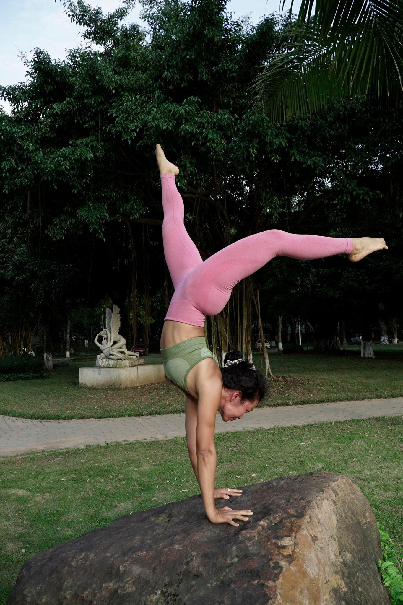 | Chị Vi Salano tập yoga mọi lúc, mọi nơi, thử thách bản thân với nhiều động tác và địa hình khó. |