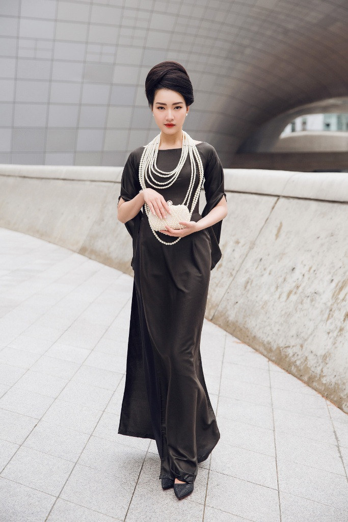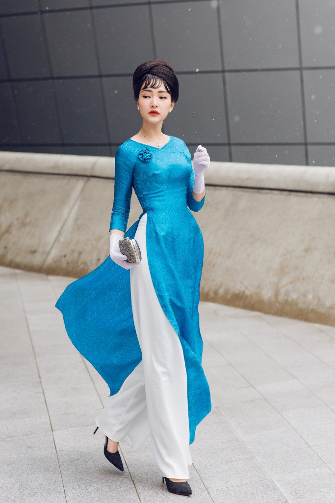Giữa tiết trời lạnh của Seoul, Ngọc Trân trở nên kiêu kỳ, quý phái trong tà áo dài xanh của NTK Tùng Vũ. Hình ảnh của Ngọc Trân gợi nhớ đến “bà Rồng” Madam Nhu với mái tóc búi cao đậm chất cổ điển cùng thần thái sang trọng, quý phái. Nàng thơ xứ Huế lựa chọn đôi găng tay trắng, cùng chiếc ví cầm tay nhỏ gọn vừa thể hiện sự quyền lực, vừa toát lên nét đẹp hiện đại.