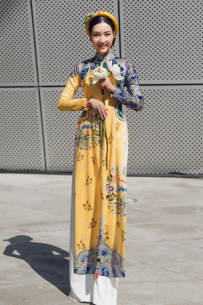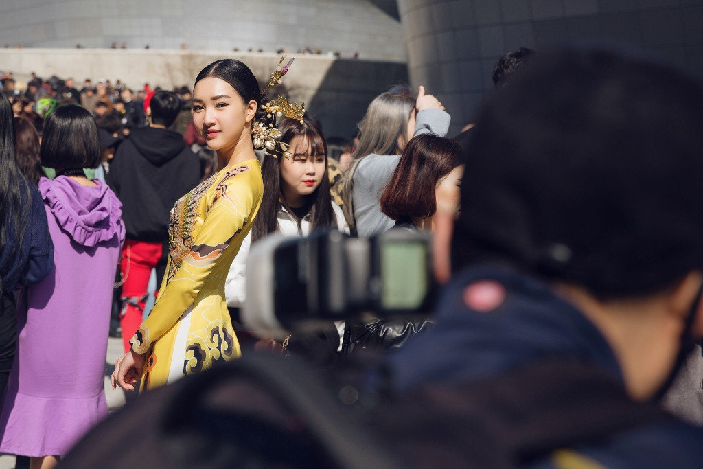 Trong ánh nắng của tiết trời Seoul, chiếc áo dài họa tiết cung đình được NTK Thủy Nguyễn “đo ni đóng giày” đã giúp Ngọc Trân tỏa sáng và nhận được sự quan tâm của truyền thông quốc tế. Những viên đá được đinh kết tinh tế góp phần tôn lên sự sang trọng, quyền lực cho người mặc. Ngọc Trân kết hợp bộ trang phục với kiểu tóc búi cao cùng chiếc trâm cài tóc vàng đồng mang đậm dấu ấn hoàng cung. Đây cũng là cách người đẹp giới thiệu chất liệu gấm đến bạn bè quốc tế.