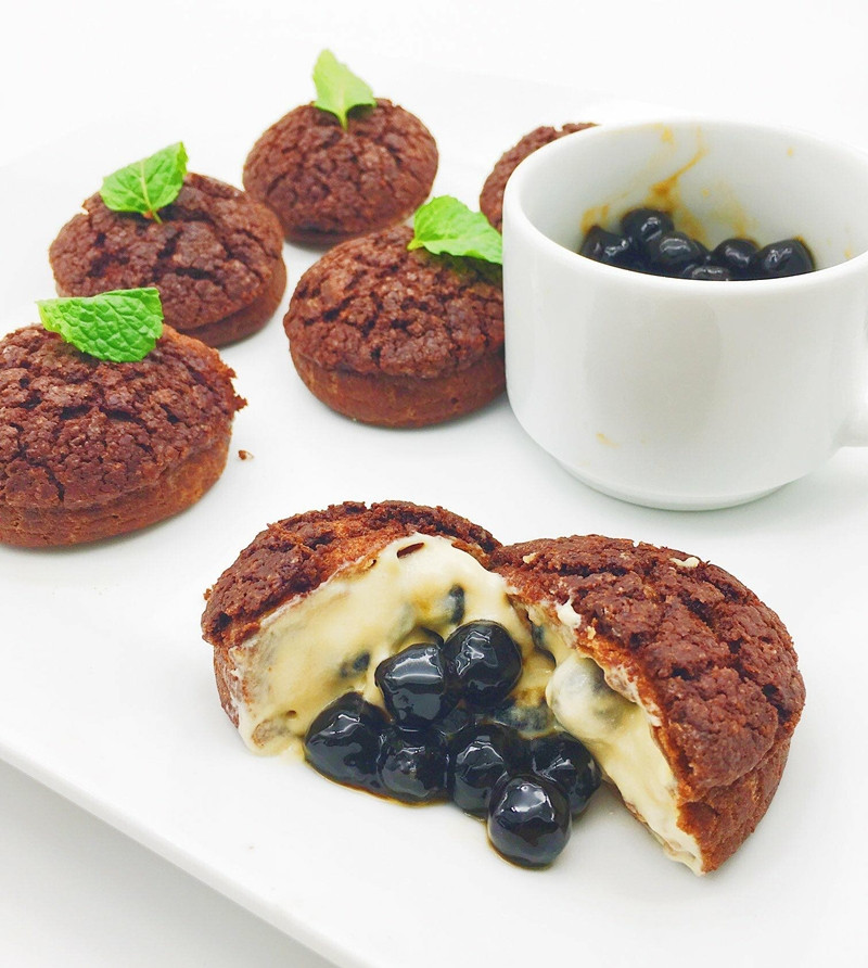 Trân Châu Đường Đen Quý phi giá đáo cùng hai món: Bánh choux trân châu và bánh cheese cake trân châu. Bánh cheese cake trân châu 100% làm từ phô mai đi với lớp foaming tan chảy, vị đăng đắng cùng hương thơm ngọt ngào của cappuchino là một điểm cộng thiệt lớn. Khi kéo lớp cố định ngoài bánh, phô mai sẽ ào ào chảy, trông rất ngon mắt. Còn siêu phẩm bánh choux trân châu cũng vô cùng độc lạ với vị giòn rụm bên ngoài nhưng lại dẻo dai bên trong khi bẻ đôi bánh ra là trân châu sẽ ào ạt “chạy” ra ngoài.