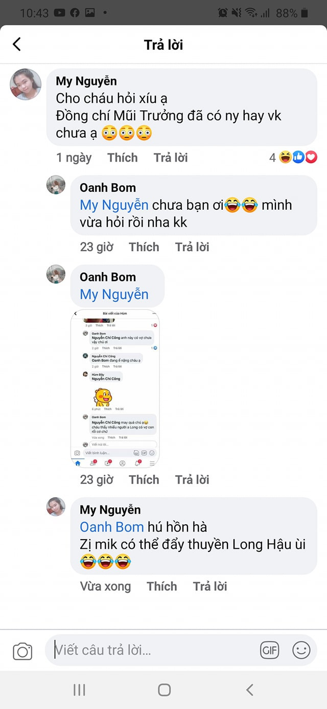 Thế nhưng, với "chiếc thuyền" của cộng đồng mạng, Hậu Hoàng đã nhanh chóng phân bua rằng: “Cháu sợ đồng chí Mũi trưởng lắm, đừng trói cháu lên thuyền”. Thế nhưng, nhiều fan tinh ý phát hiện ra rằng, cô nàng rất nhanh chóng trả lời hết các comment có liên quan đến Mũi trưởng Long trên các trang mạng xã hội.