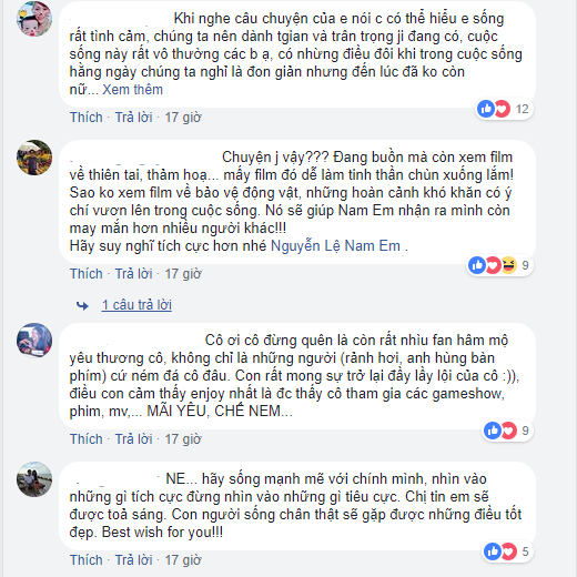 Bên cạnh nhiều người cho rằng cô lại "diễn trò", cố gắng lấy sự thương cảm của khán giả, thì vẫn có những bình luận tích cực mong Nam Em sớm vượt qua những đau khổ để tập trung cho sự nghiệp.