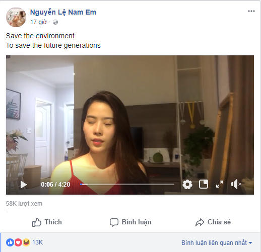 Mới đây nhất, Nam Em đăng tải một đoạn clip trên trang cá nhân với nét mặt buồn và ngồi tâm sự về chuyện... bảo vệ Trái Đất với dòng caption: "Save the environment. To save the future generations". (tạm dịch: Bảo vệ môi trường để bảo vệ những thế hệ tương lai).