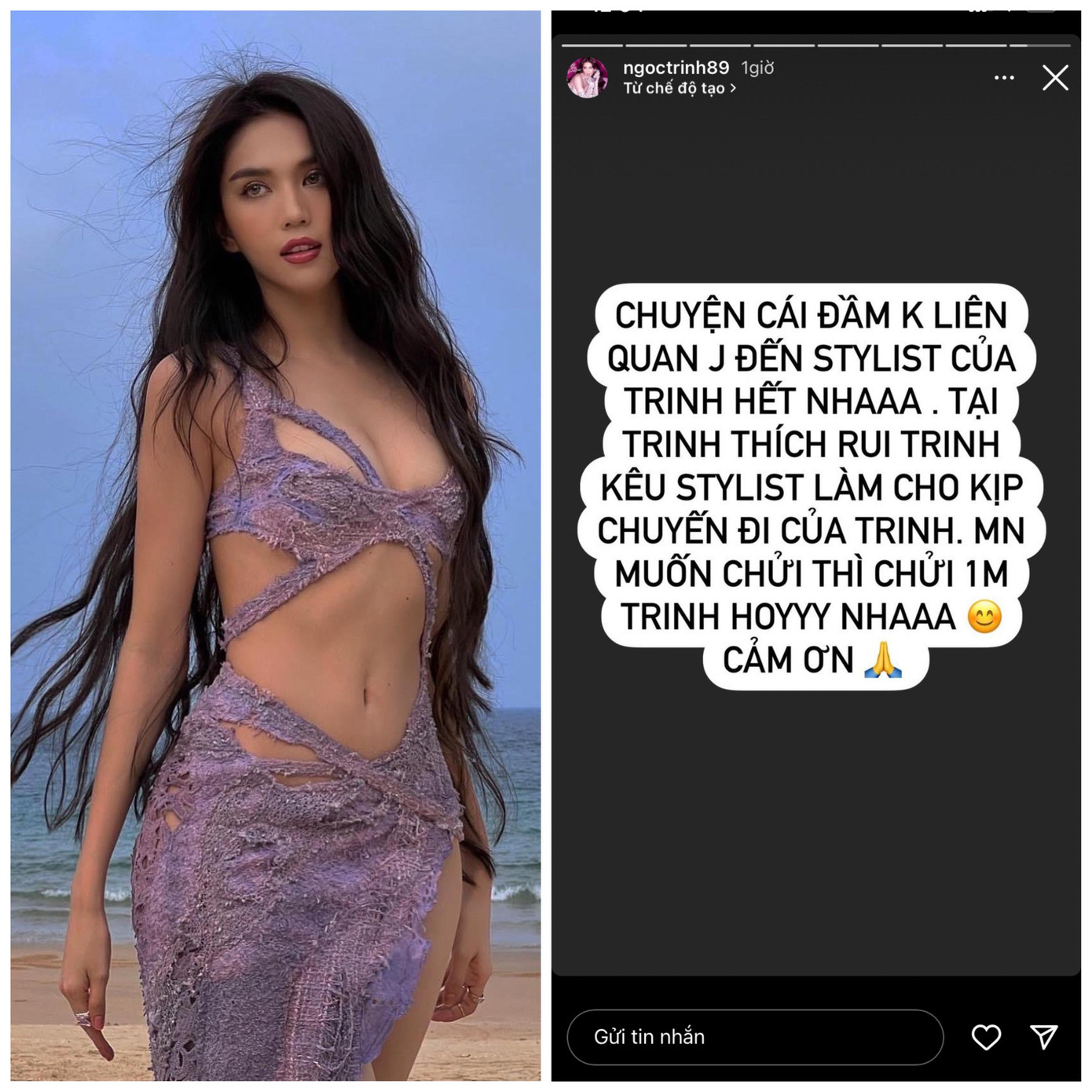 Sau đó, chính Ngọc Trinh cũng thừa nhận bản thân đã "mượn ý tưởng" thiết kế Kendall Jenner từng diện. Theo đó, "nữ hoàng nội y" giải thích trên Story: "Chuyện cái đầm không liên quan gì đến stylist của Trinh hết, tại Trinh thích rồi Trinh kêu stylist làm cho kịp chuyến đi của Trinh".