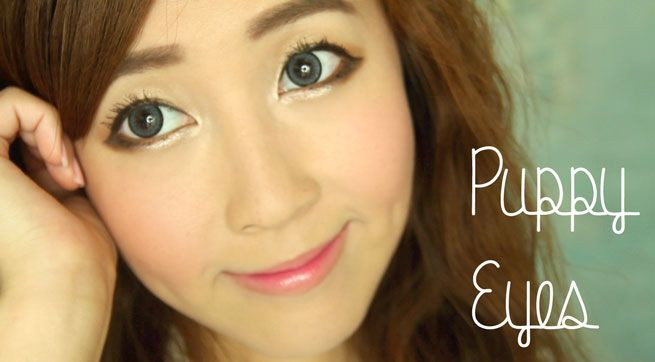 Puppy eyes make-up là kiểu trang điểm mắt cún con, đây là phong cách cực hợp với những cô nàng muốn có đôi mắt to tròn, long lanh đáng yêu. Thay vì kẻ eyeliner xếch lên ở đuôi mắt như mắt mèo, bạn sẽ kẻ hướng xuống dưới tạo cảm giác như mắt cụp. Sau đó, dùng phấn mắt đen hoặc nâu tán thêm phần đuôi của mí mắt dưới.