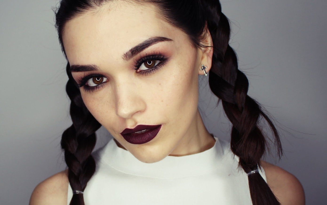 Môi tím và phấn mắt màu đỏ rượu tạo cảm giác vừa bí ẩn vừa táo bạo. (Ảnh: easyNeon)