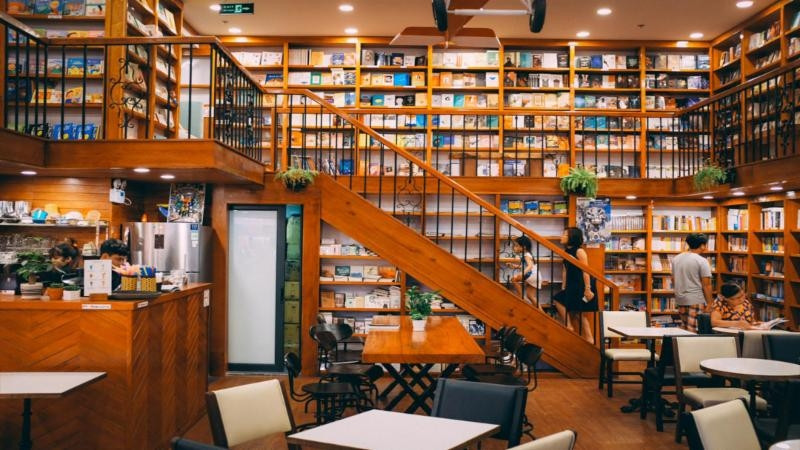Từ ban công, mình còn có thể quan sát được cả thư viện nhỏ dưới ánh đèn vàng ấm áp được đặt khắp tầng gác xép. Hãy thử quan sát cách mọi người chăm chú đọc sách ở mỗi góc riêng hay chú tâm làm việc. Những quyển sách với nhiều thể loại từ bất hủ, tình cảm đến sách kỹ năng sống... được sắp xếp gọn gàng, ngăn nắp trên kệ với những mảnh giấy note bất chợt đâu đó chứa đựng những điều dễ thương, lời gợi ý đọc những quyển sách thú vị.
