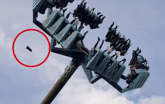 Video quay lại khoảnh khắc một mảnh của chiếc ghế trò đu quay tốc độ cao Vortex trong công viên Thorpe Park ở Anh bất ngờ văng xa cách mặt đất gần 20 m khi đang hoạt động khiến nhiều người thót tim.