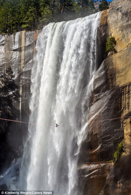 Kimberly Weglin, 23 tuổi, tập thăng bằng trong hai năm trước khi bắt đầu màn biểu diễn động tác yoga táo bạo của mình trên một sợi dây mảnh mai, vắt ngang thác nước Vernal ở Công viên quốc gia Yosemite, California, Hoa Kì.