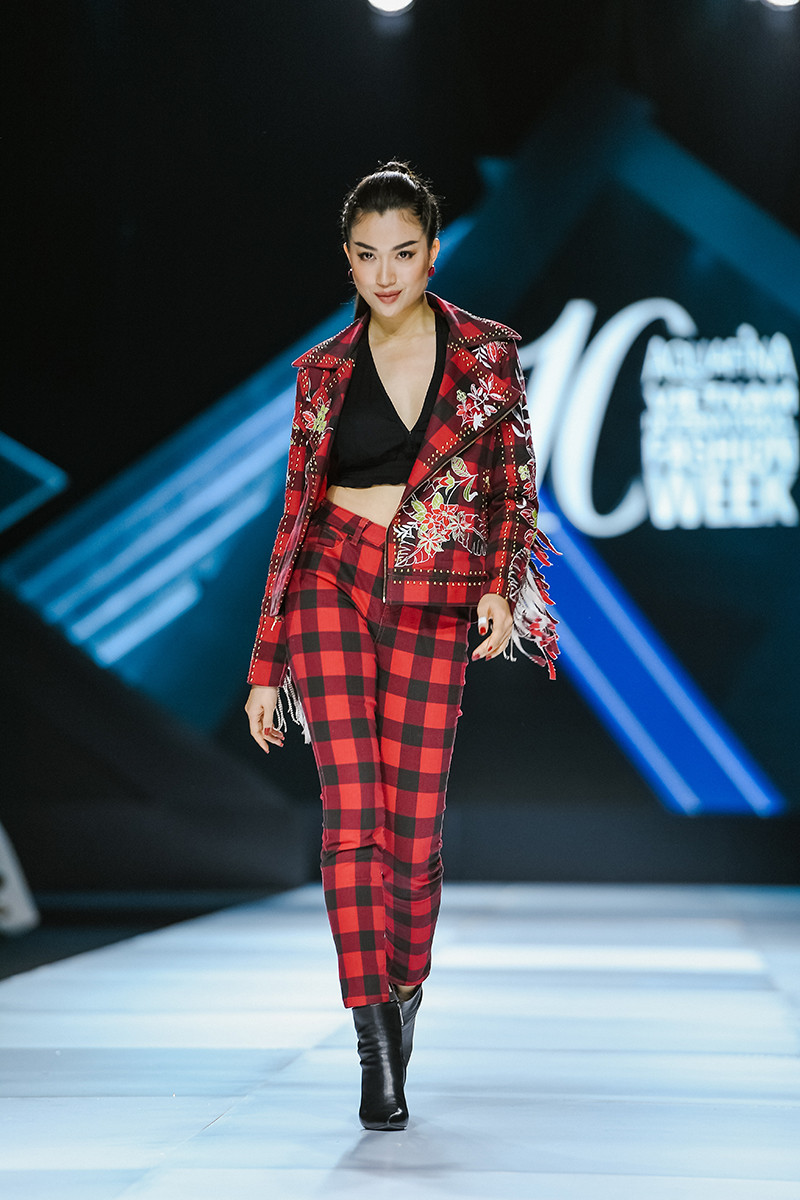 Á hậu Lệ Hằng xuất hiện ấn tượng với mẫu denim caro đỏ tua rua, đây là kỹ thuật nhuộm màu tiên tiến nhất của V-SIXTYFOUR.
