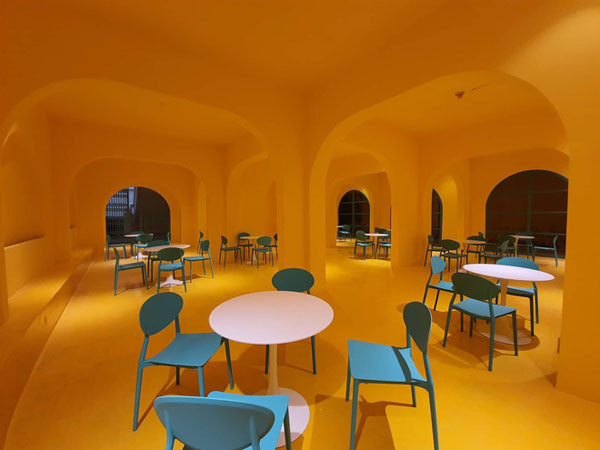 Không gian căng-tin nơi đây được sử dụng tông chủ đạo là màu vàng rực rỡ. Điểm nhấn bên trong chính là những chiếc bàn màu trắng, xung quanh là bộ ghế màu xanh. Sự kết hợp màu sắc hài hòa mang đến những trải nghiệm cảm giác mới mẻ cho sinh viên trong trường.