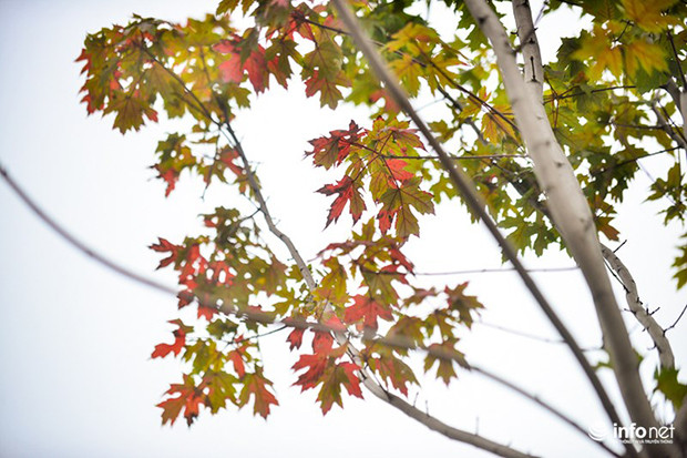 Không chỉ thế, lá cây cũng đã đổi sang màu lãng mạn hệt như chất thu của trời Tây. Theo ghi nhận, một cây phong trên đường Trần Duy Hưng đã có khoảng 1/3 số lượng lá đổi màu từ xanh, vàng nhạt, vàng cam tới đỏ đậm.