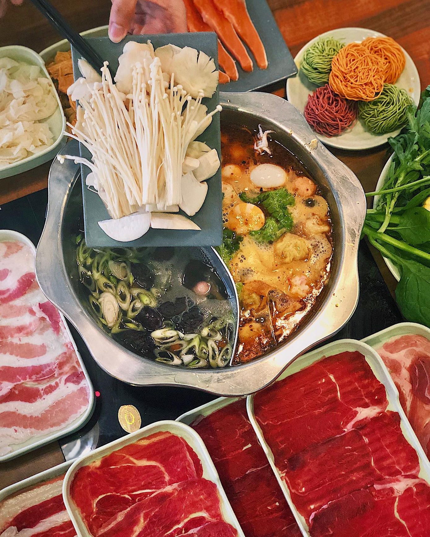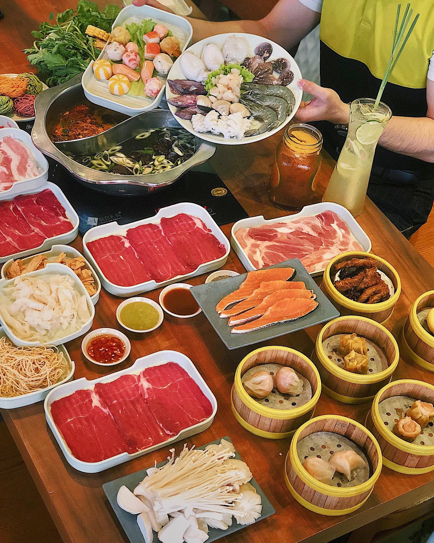 Thực đơn hệt như mê cung với rất nhiều lựa chọn, nên bạn có thể nhờ nhân viên tư vấn nếu không muốn bị hoa mắt nhé. Nếu đi hai người, hãy gọi set 319K, ăn bao no và đã. Dimsum, đĩa hải sản (tôm, mực ống, bạch tuộc, nghêu, còi sò điệp), khay viên thả lẩu “đủ mặt anh tài” cho đến mấy loại thịt bò, lá xách bò xịn xò và 2 phần phi lê cá hồi xịn tặng kèm.