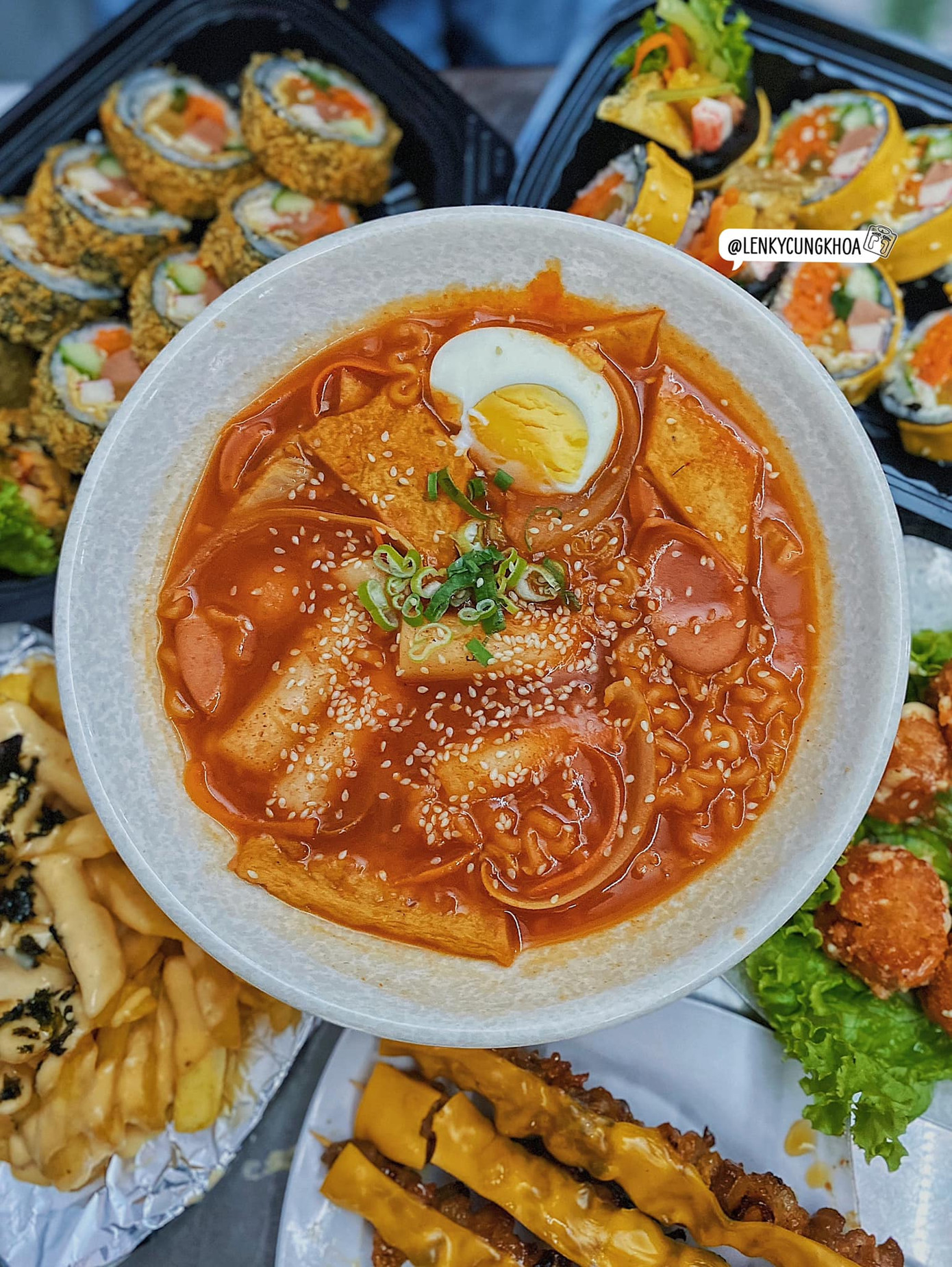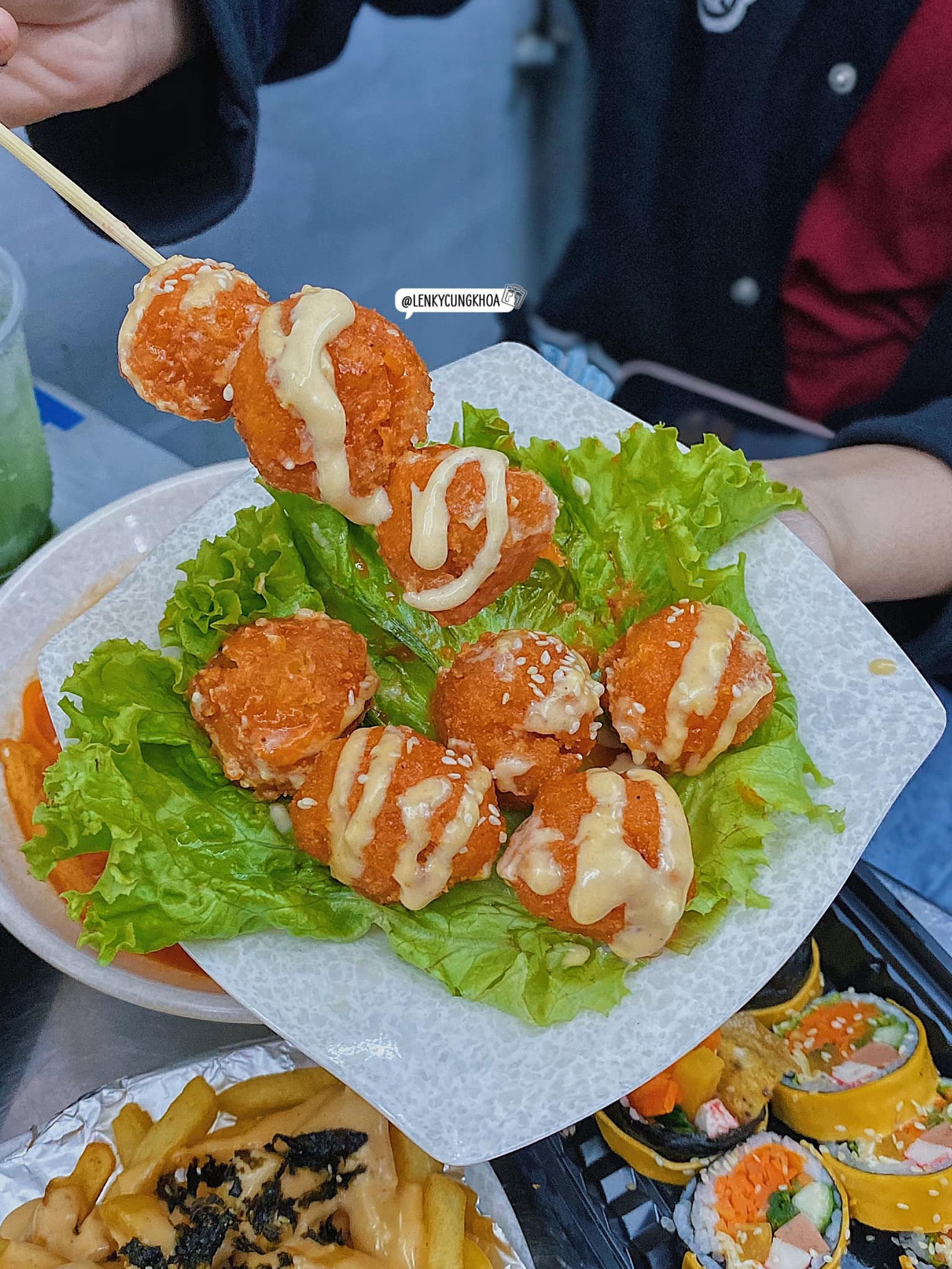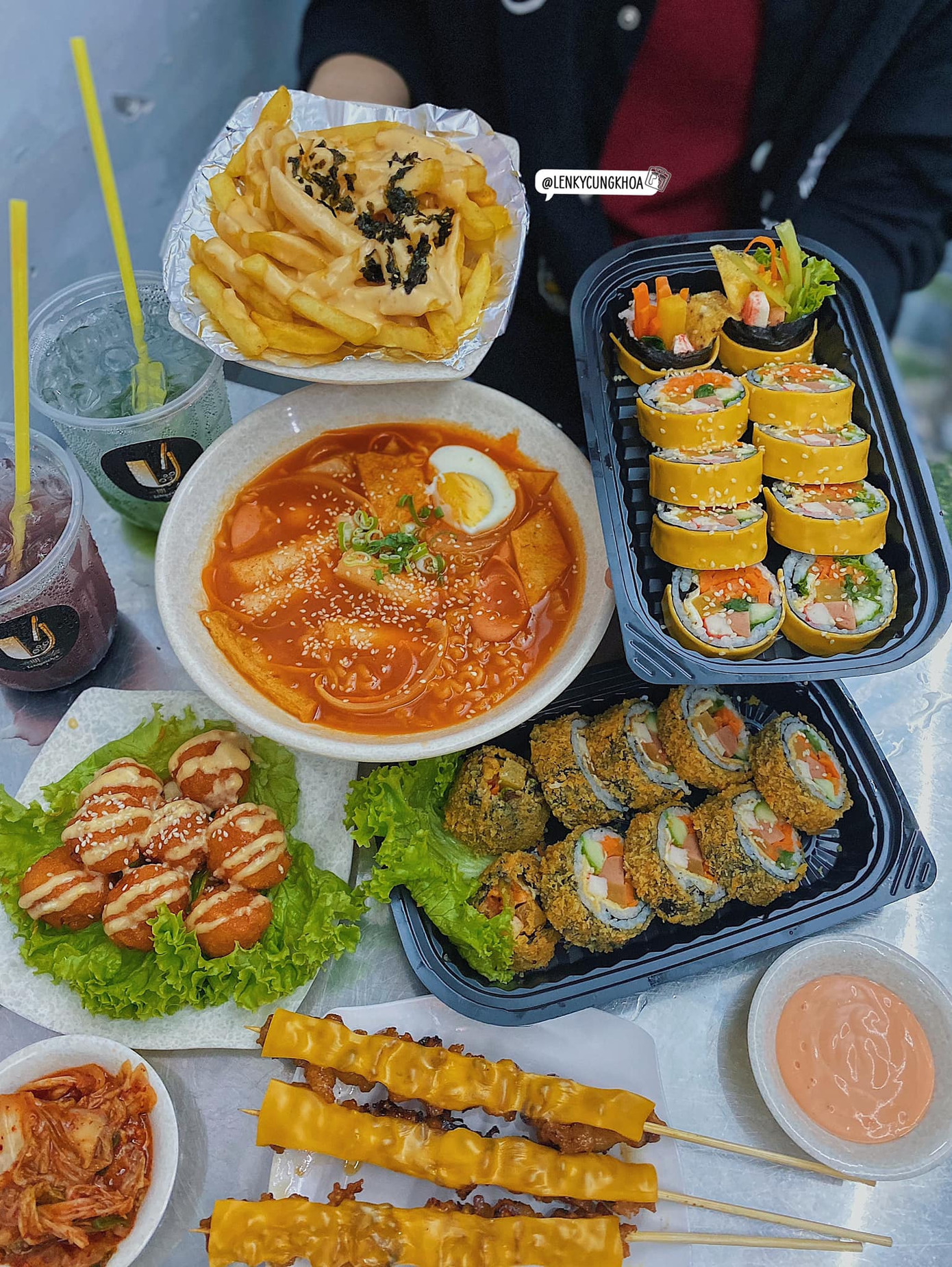 Nếu bạn đi nhóm chừng 4 người, có thể gọi một bàn 7 món: Tokbokki ramen, kimbap phô mai, gà sốt chua ngọt, khoai tây chiên phô mai… tính ra chỉ hết 70K/ người. Ngon và no xỉu! Kimbap mập ú và đầy ụ topping, lớp cơm gói khá mỏng, chủ yếu toàn đồ ăn nên chất lượng ổn áp. Khoai tây chiên phô mai gây thương nhớ bởi nước sốt phô mai béo béo đê mê.