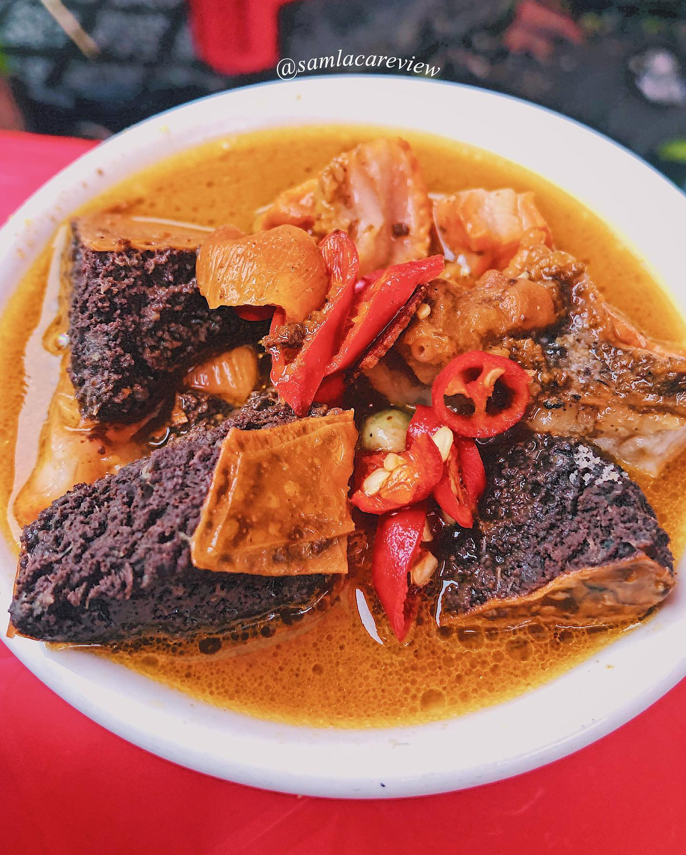 Ảnh: Sam NguyễnHàng phá lấu nằm ở ngay góc ngã tư lúc nào cũng nườm nượp khách. Phá lấu ngon đúng điệu với phần nước dùng sóng sánh, béo thơm phưng phức. Bao tử tai heo thấy giòn giòn sần sật, phèo mềm thơm, tất cả nguyên liệu đều thấm gia vị rất đậm đà: Một chút ngọt, một chút mặn, một chút cay.