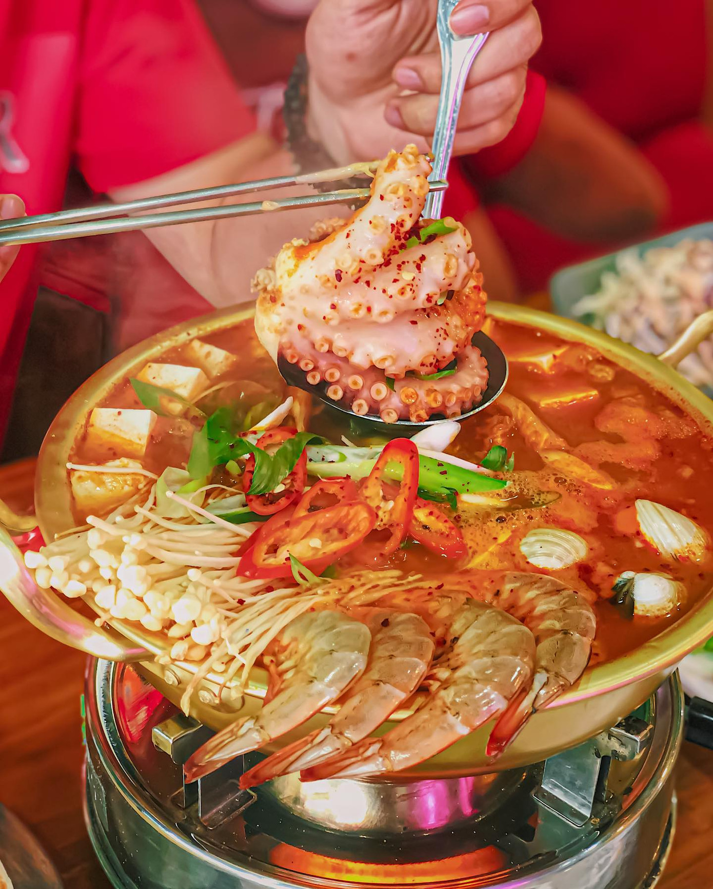 Bánh Xếp & Kimbap Miss Korea đầy nhân ăn kèm sốt đặc biệt của quán cũng ngon tê tái luôn. Nếu đã tới đây, bạn nhất định phải thử lẩu kim chi hải sản với vị cay vừa đủ, kim chi giòn, tàu hũ dai và thơm. Ngoài nghêu, tôm thì bên dưới có rất nhiều thịt ba chỉ thái nhỏ ăn cùng cơm trắng hay mì gói.