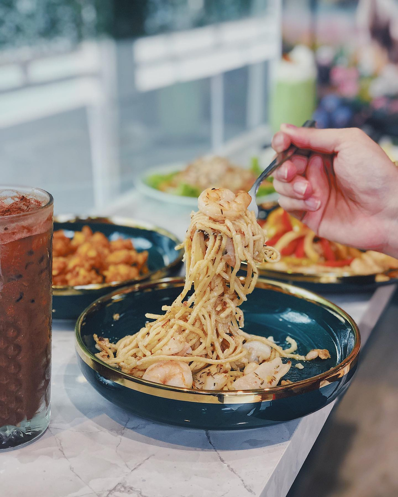 Sụn Gà Chiên Giòn Sốt Hoàng Kim với miếng sụn gà to, giòn rụm phủ ngoài lớp bột xốp và sốt hoàng kim đặc, béo bùi rất dễ gây nghiện. Mì Ý Hải Sản Sốt Kem (135K) có hương vị xuất sắc miễn bàn, sốt kem béo vừa tới, tôm & mực tươi rói cũng chính là điểm sáng cho món này.