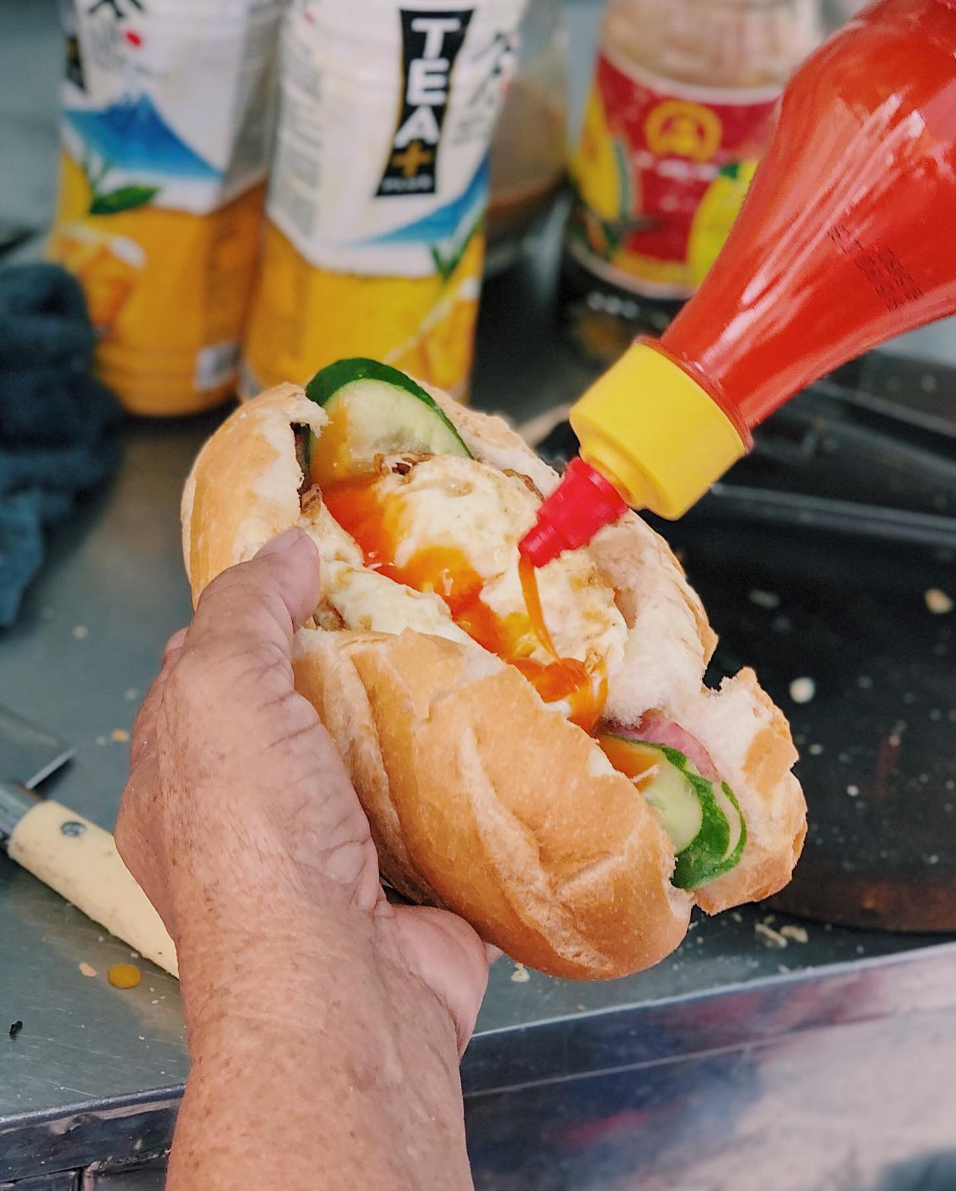 Xe bánh của bà đắt khách nhất là vào buổi sáng, các anh chị nhân viên văn phòng và người dân ở khu chung cư gần đó ghé mua ủng hộ liên tục. Một ổ bánh mì giá 15K có khá nhiều thịt nguội kèm thêm trứng ốp-la, nhìn hấp dẫn vô cùng. Buổi sáng, xe ăm ắp thịt nguội, chà bông, paté và trứng. Tới trưa là đồ ăn đã vãn, bà tranh thủ bán cố rồi đẩy xe về nhà nghỉ.