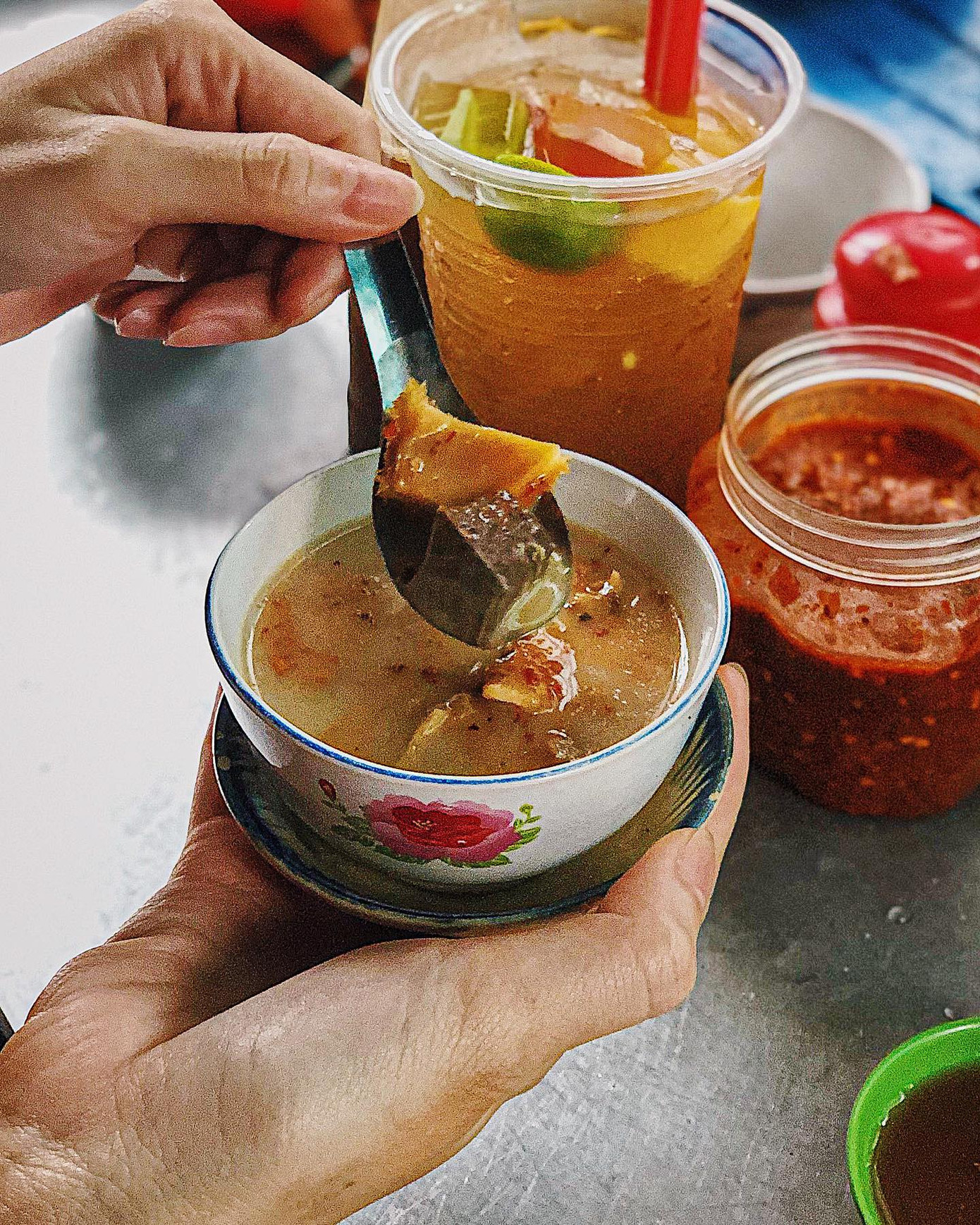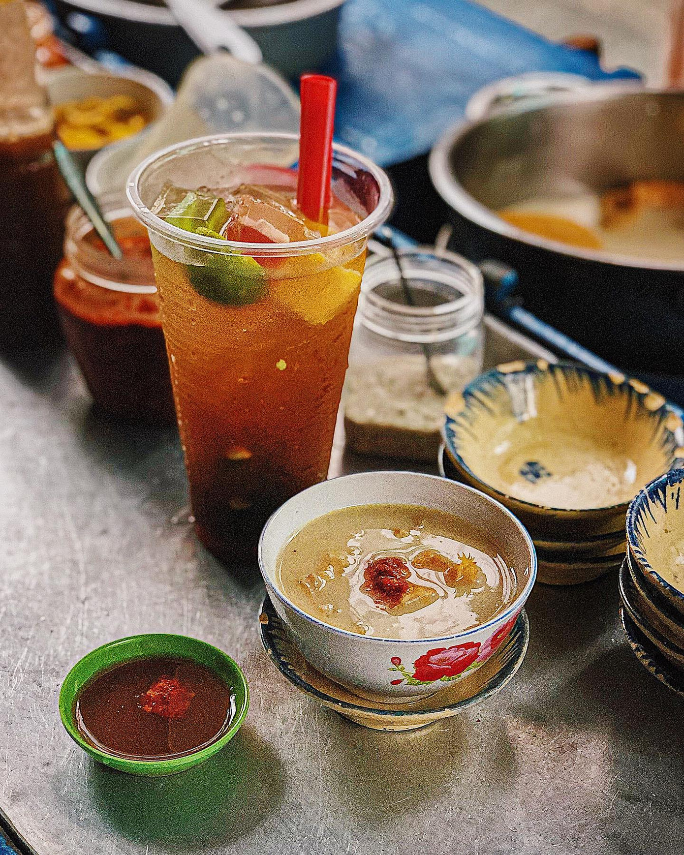 Một chén phá lấu chỉ khoảng 20K với một số khăn lông (thanh long), khế, phèo, tổ ong và lá mía và không thể nhắc tới phần nước cốt dừa trắng sữa thơm béo hấp dẫn vô cùng. Nước chấm và sa tế ở đây cũng thuộc hàng cực phẩm đó bạn, nhớ ăn kèm.