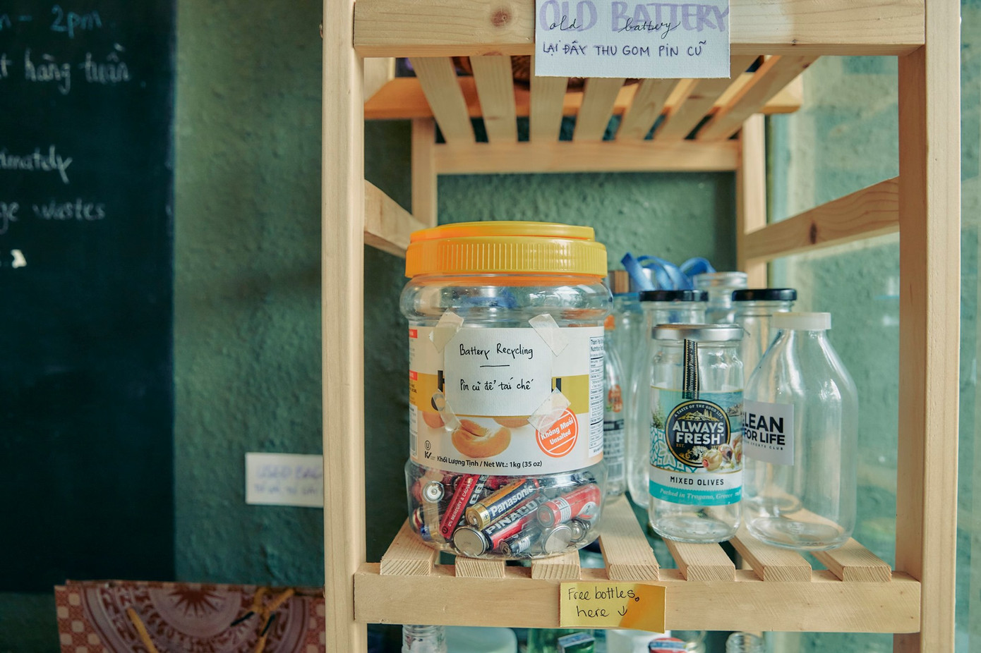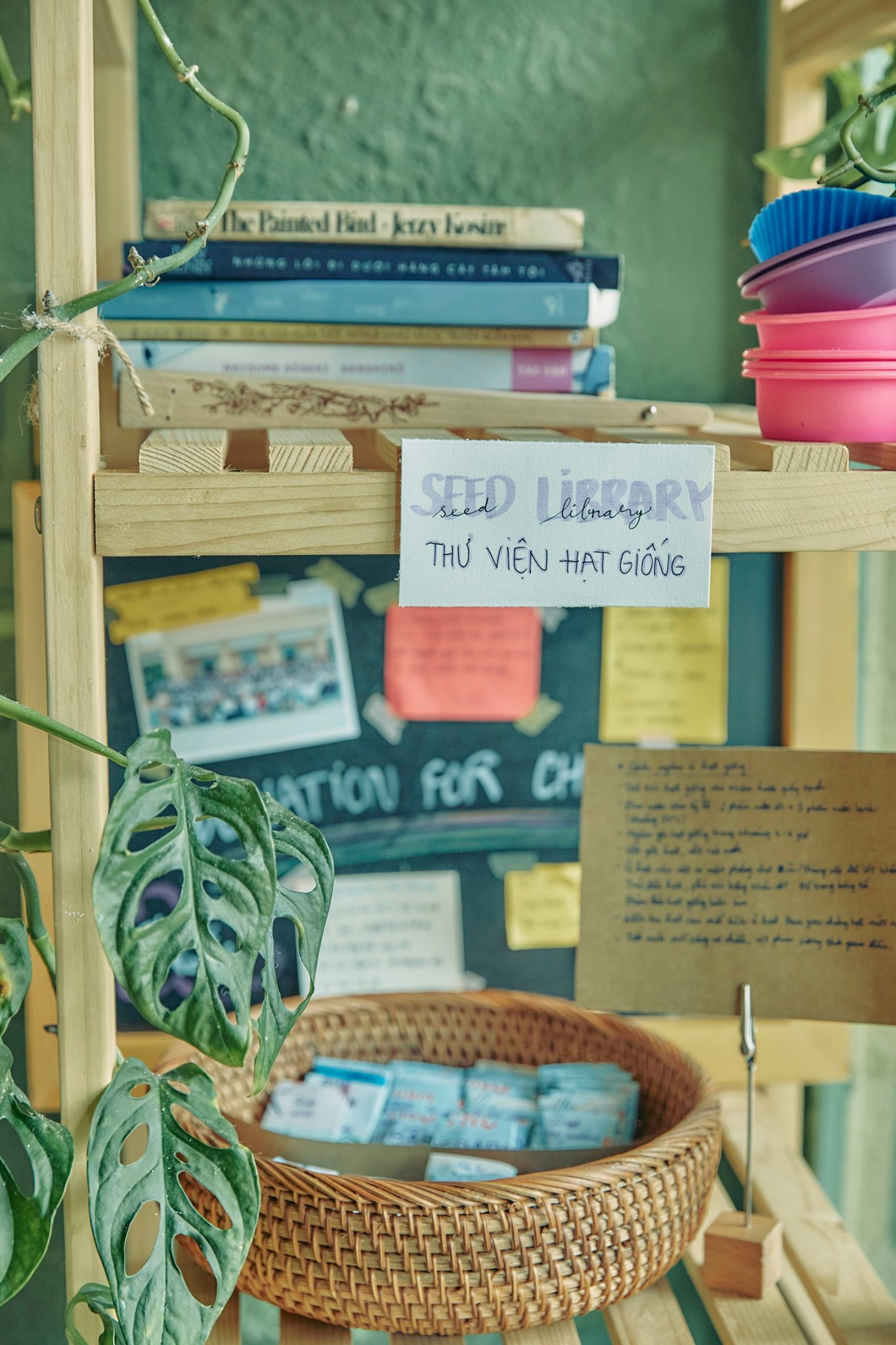 Ở đây cũng là nơi để mọi người trong cộng đồng có thể đóng góp, chia sẻ và nhận hạt giống trồng rau, cây, hoa miễn phí. Lại đây cũng hỗ trợ thu gom các vật dụng như pin cũ, ốp lưng điện thoại, chai lọ cũ… và đưa chúng về đúng nơi tái chế phù hợp. Ngoài ra, quán cũng có những góc dán đầy những tờ giấy ghi chú trao đổi nhiều thông tin hữu ích về lối sống xanh.