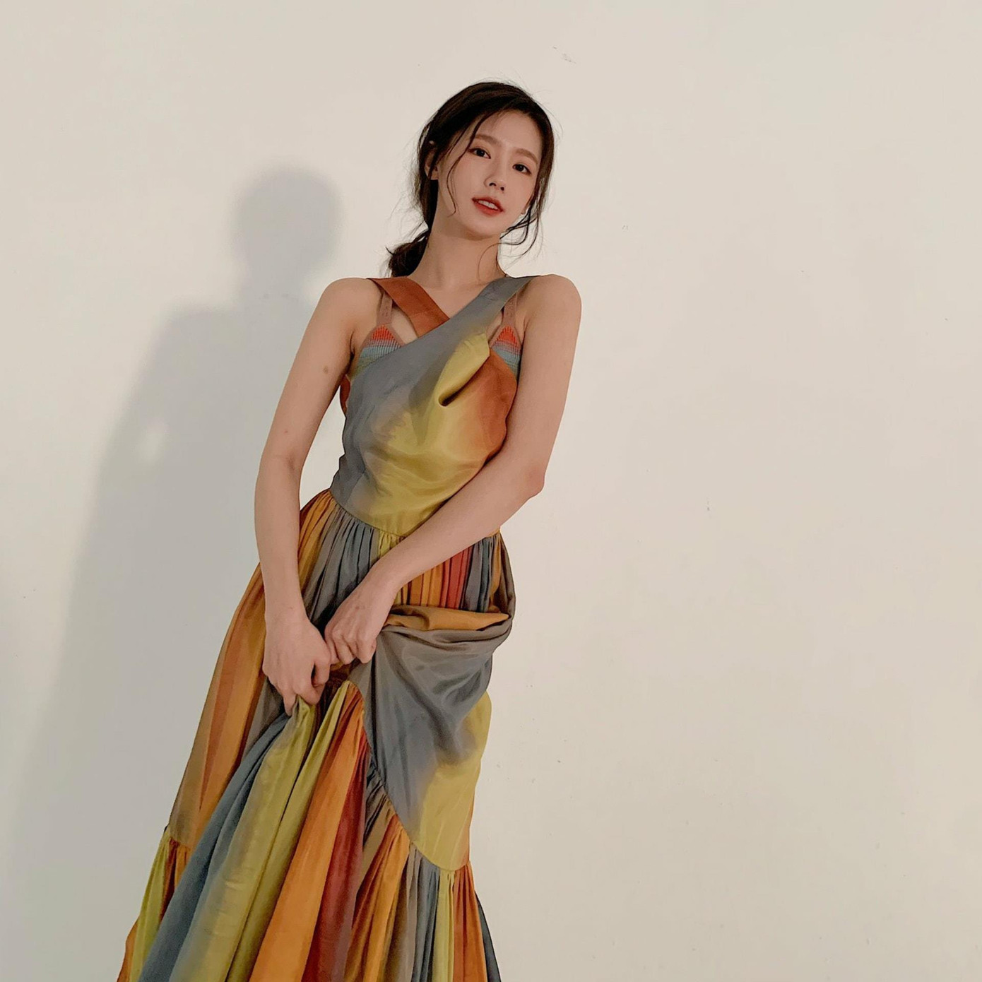 Năm ngoái, trong bộ sưu tập Xuân Hè của Dior có một mẫu váy maxi rực rỡ sắc màu, chắc chắn sẽ giúp người mặc nổi bật trong mọi bức hình và vì thế, rất nhiều sao nữ châu Á đã chẳng ngại đụng hàng mà diện nó trong nhiều dịp.