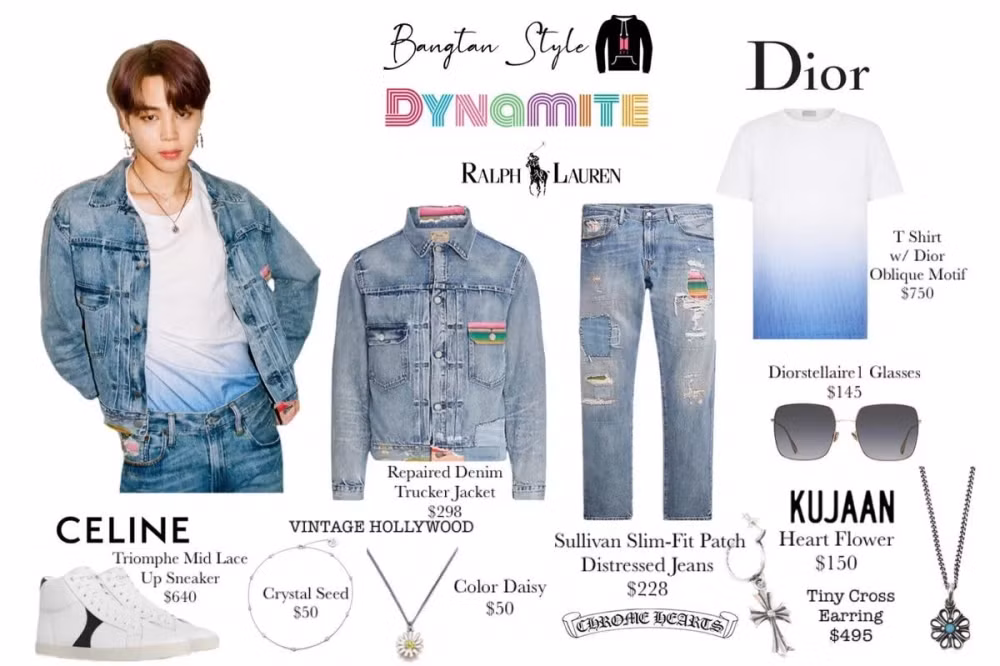 Tiếp đến là bộ trang phục của Jimin, anh mặc nguyên bộ denim của Ralph Lauren, với chiếc áo có giá khoảng 6,9 triệu đồng, quần có giá khoảng 5,3 triệu đồng. Chiếc áo phông ombre bên trong là thiết kế của Dior có giá khoảng 17,4 triệu đồng. Jimin đi đôi sneaker của Celine có giá khoảng 15 triệu đồng.