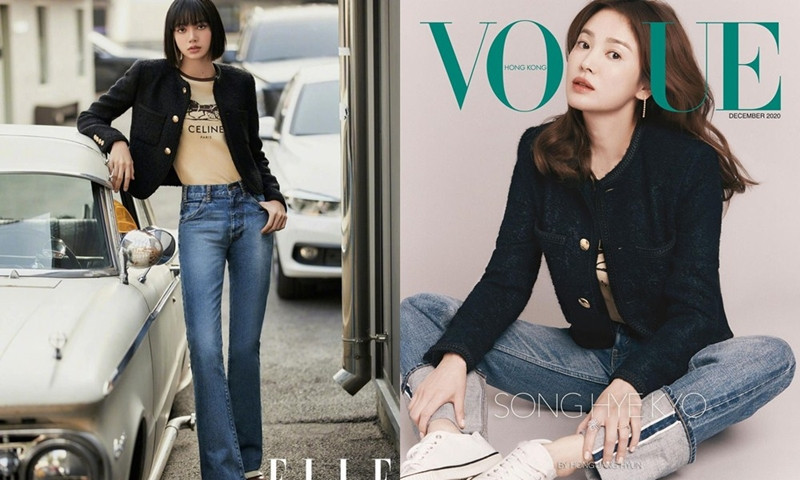 Đầu tiên là set đồ trên bìa VOGUE Hồng Kông gồm nguyên bộ trang phục của CELINE, Song Hye Kyo đụng hàng với đại sứ thương hiệu của hãng là cô nàng Lisa (BLACKPINK) cá tính xinh đẹp. So về độ trẻ trung thì cho dù “chị đại” hơn Lisa tới 16 tuổi nhưng đặt hai bức ảnh cạnh nhau, thật khó để phân biệt tuổi tác của cả hai mỹ nhân.