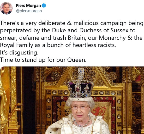 Sau đó, Morgan lên Twitter - nơi ông có gần 8 triệu người theo dõi, tiếp tục chỉ trích Harry và Meghan, cho rằng cặp đôi này đang thực hiện một chiến dịch “cố ý và ác ý” để bôi nhọ Hoàng gia. Ông kêu gọi công chúng Anh đáp trả bằng chiến dịch “đứng lên vì Nữ hoàng của chúng ta” (Stand up for our Queen).