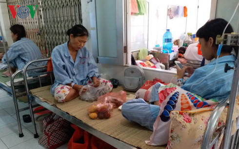 Hiện tại đang có 210 bệnh nhân sốt xuất huyết điều trị nội trú. Đặc biệt, tại khoa Truyền nhiễm, dù đã kê thêm 35 giường, nhưng bệnh nhân vẫn phải nằm ghép 2 đến 3 người/1 giường. Phòng làm việc của bác sỹ cũng được kê thêm giường gấp để bệnh nhân nằm truyền dịch. Toàn bộ giường, chăn chiếu, quạt của nhân viên y tế cũng được huy động để bệnh nhân dùng.