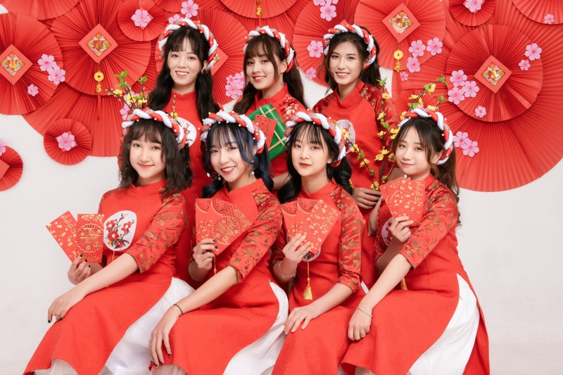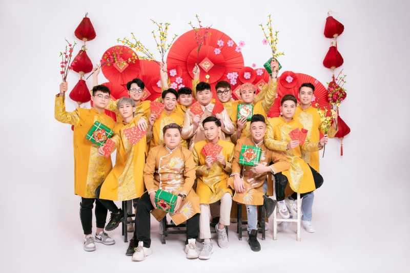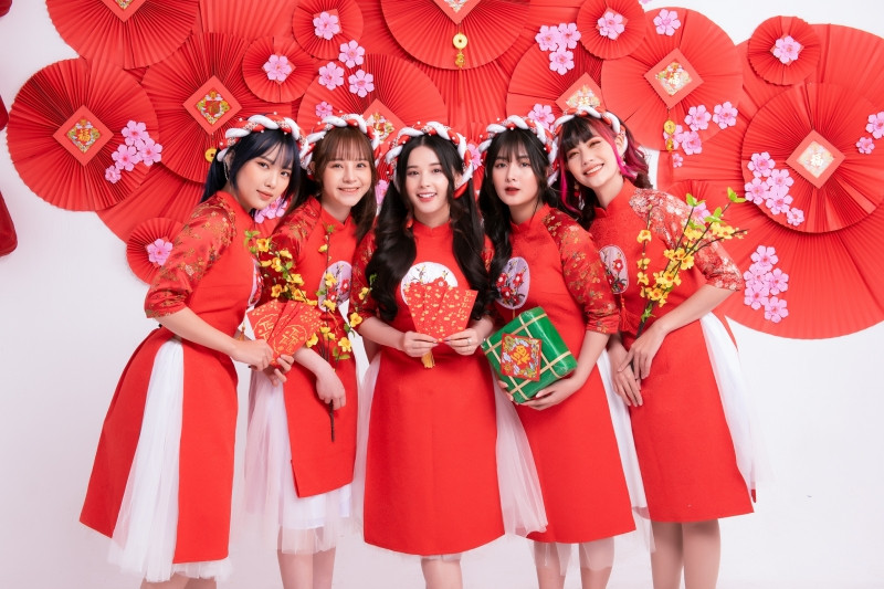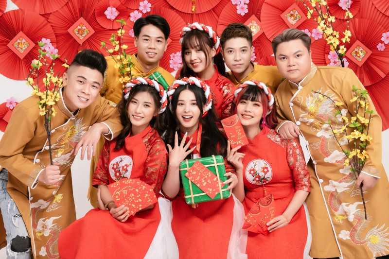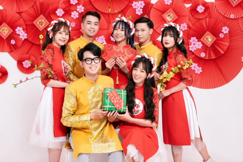 Trong bộ ảnh, những chàng trai, cô gái khoác lên mình chiếc áo dài cách tân với tone màu chủ đạo đỏ - vàng đặc trưng mỗi dịp Tết đến Xuân về. Bên cạnh đó, những cành mai, cành đào, bánh chưng xanh và bao lì xì đỏ cũng khiến những bức hình ngập tràn không khí vui tươi, đầm ấm.