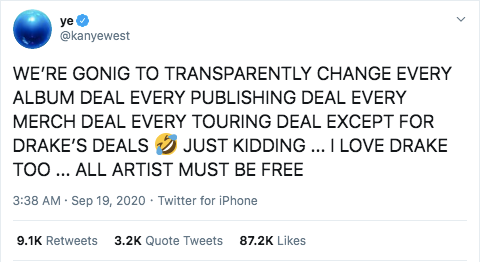 Hay dòng tweet kế tiếp: “Chúng ta sẽ thay đổi một cách minh bạch mỗi thỏa thuận về album, thỏa thuận về phát hành, thỏa thuận về các đồ bán kèm, thỏa thuận mỗi tour diễn trừ những thỏa thuận liên quan tới Drake. Tôi đùa đó... Tất cả nghệ sĩ đều phải được tự do” (tạm dịch).