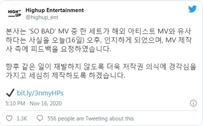 “Chúng tôi đã nhận được những cáo buộc về việc một trong những cảnh quay của MV "So Bad" giống với MV của một nghệ sĩ nước ngoài. Chúng tôi đã yêu cầu công ty sản xuất phản hồi về vấn đề này. Để ngăn chặn điều tương tự tái diễn trong tương lai, chúng tôi sẽ ý thức hơn về vấn đề bản quyền và cẩn thận hơn trong khâu sản xuất.”