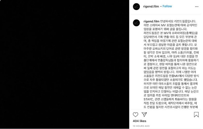 Rigend Film, công ty sản xuất MV So Bad cũng ngay lập tức phản hồi lại trên tài khoản IG sau thông báo của Highup với hình ảnh đi kèm đen xì, Rigend Film nhận lỗi sai, xin lỗi công ty Highup, nhóm STAYC và hứa hẹn sẽ cố gắng tạo ra nhiều sự sáng tạo trong tương lai (thay vì đi copy lại).