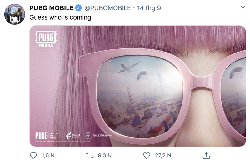 Tài khoản Twitter chính thức của PUBG Mobile hôm 14/9 đã tung ra một hình ảnh chụp một phần khuôn mặt của một cô gái tóc hồng, đeo kính râm màu hồng, kèm theo dòng chữ: "Thử đoán xem ai sắp xuất hiện?".