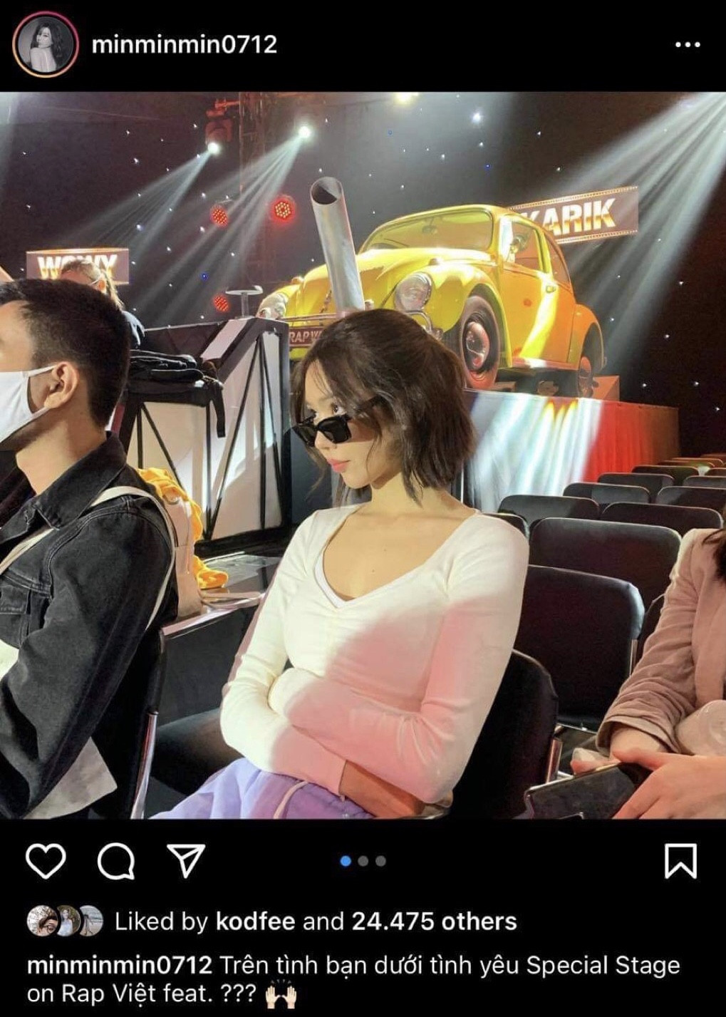 MIN - nữ ca sĩ đang "gây bão" cộng đồng mạng với MV Trên Tình Bạn Dưới Tình Yêu cũng gây tò mò không kém khi đăng tải bức hình check-in tại sân khấu Rap Việt cùng dòng trạng thái úp mở: "Trên tình bạn dưới tình yêu Special Stage on Rap Việt feat ???". Có lẽ nào cô nàng cùng bài hit của mình sẽ có một sân khấu cực đặc biệt tại Rap Việt cùng một trong những rapper của chương trình chăng?