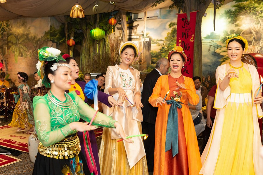 Siêu mẫu Vũ Thu Phương nền nã trong chiếc áo tứ thân tông vàng Nếu các nàng Hậu như Giáng My, Hương Giang, H’Hen Niê, Khánh Vân, Kim Duyên… đều nô nức với trang phục bắt mắt thì vợ chồng Khánh Thi - Phan Hiển chọn áo dài tông xanh đồng điệu. Tất cả đều rất thích thú khi được trải nghiệm nhảy sạp, múa cổ truyền, xin chữ ông đồ và thử têm trầu.