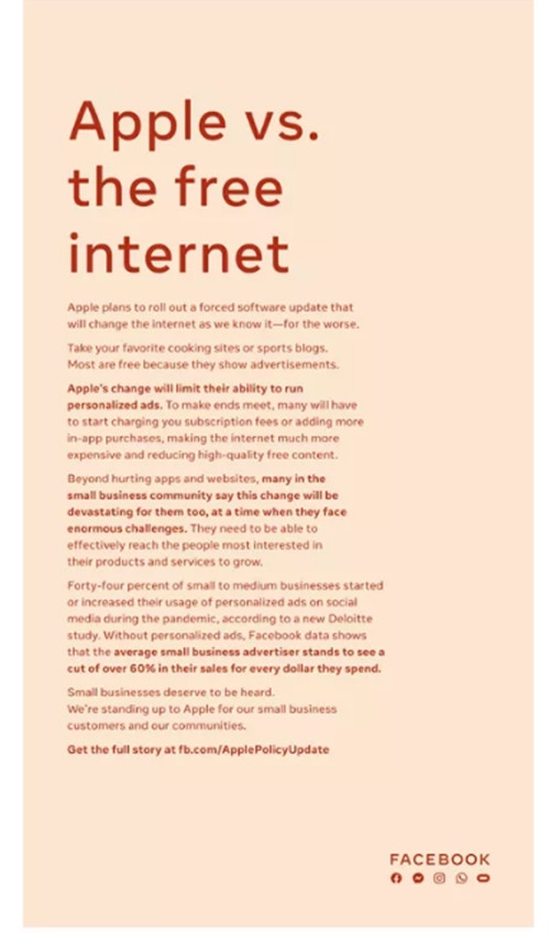 Vì vậy, Facebook đang thực hiện những “đòn” cuối cùng để buộc Apple phải thoái lui. Facebook đăng quảng cáo trên các tờ báo giấy uy tín như The Washington Post và The Wall Street Journal, nhằm cố tập hợp các “đồng minh” của mình, là hàng triệu doanh nghiệp nhỏ, để họ mua quảng cáo trên Facebook và Instagram.