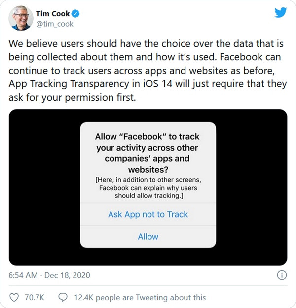 Cho nên, Facebook quay sang chỉ trích Apple: “Hành động của Apple không phải là vì tính riêng tư, mà là vì lợi nhuận”. Theo tuyên bố của Facebook, thì Apple sẽ thu lợi từ tính năng mới này, do sẽ ngày càng có nhiều thứ trên mạng hoặc trong các ứng dụng mà bạn phải đăng ký thì mới xem, mới dùng được, rồi Apple thu hoa hồng từ App Store của mình.