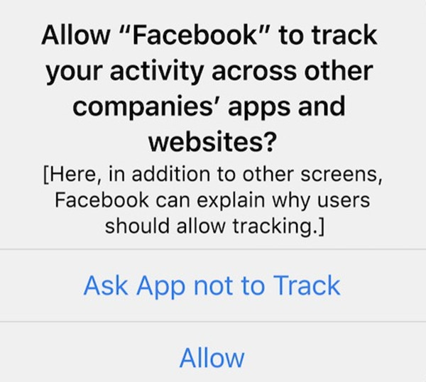 Đúng vậy, trong vài tuần tới, Apple dự định sẽ thêm một tính năng mới trên các thiết bị của mình, thông báo cho người dùng biết khi một ứng dụng, như Facebook, cố “theo dõi hoạt động của bạn trên các ứng dụng và trang web của các công ty khác”. Khi đó, bạn sẽ có tùy chọn là “Cho phép” hoặc “Yêu cầu ứng dụng không được theo dõi”.